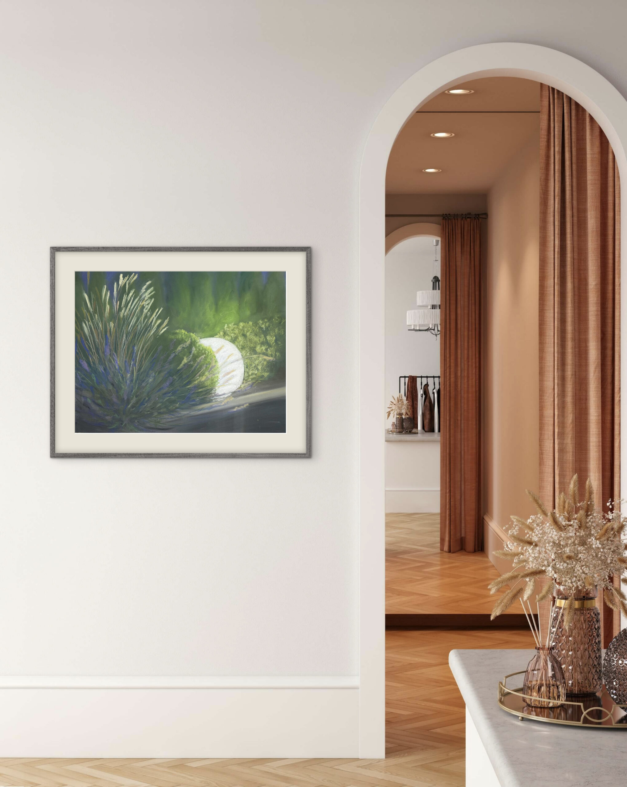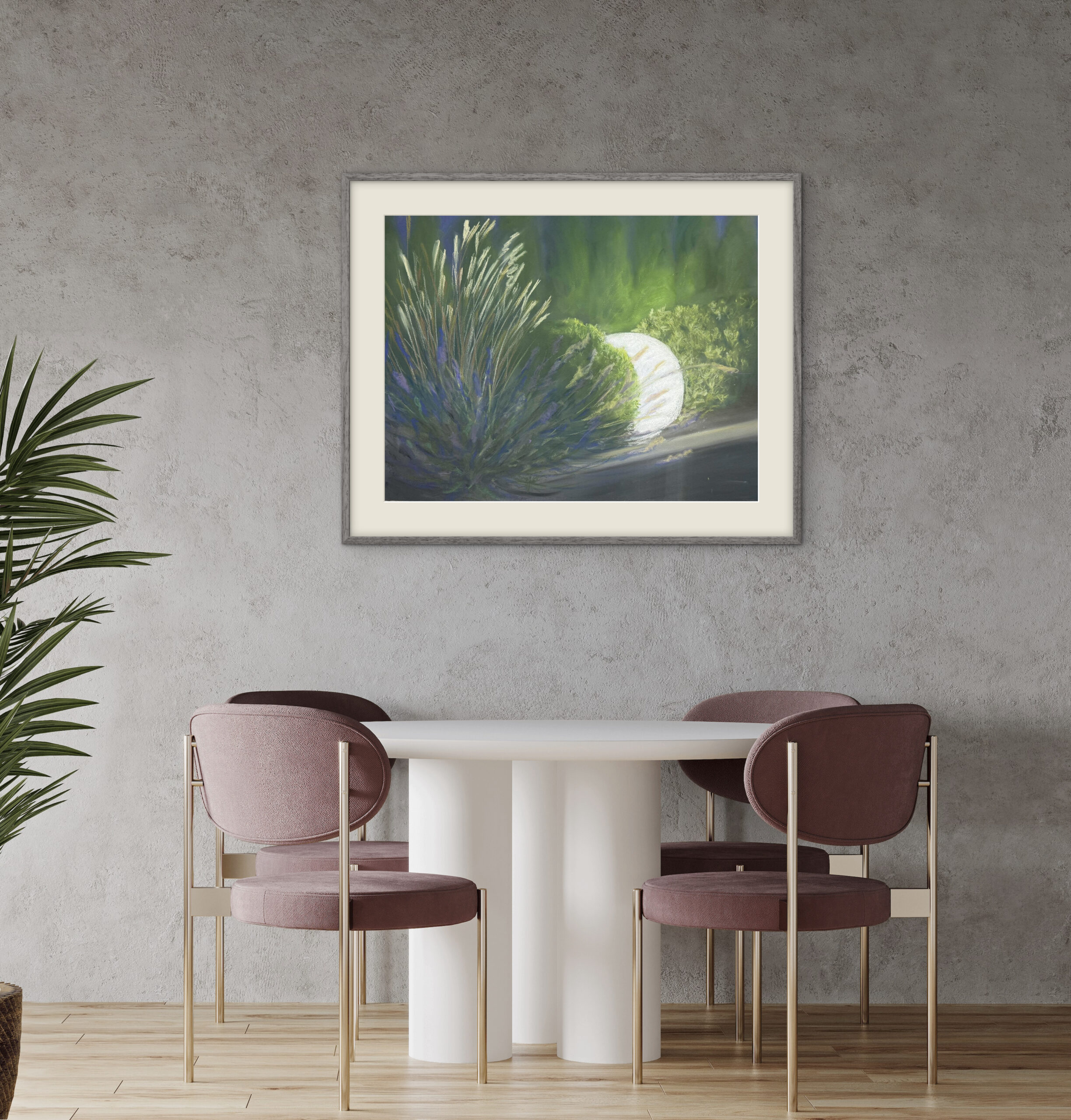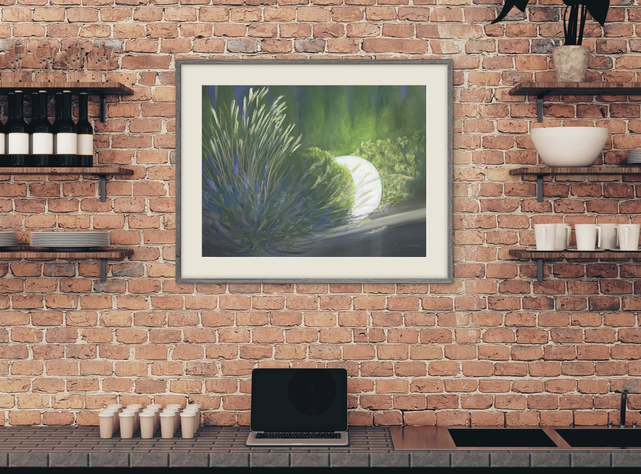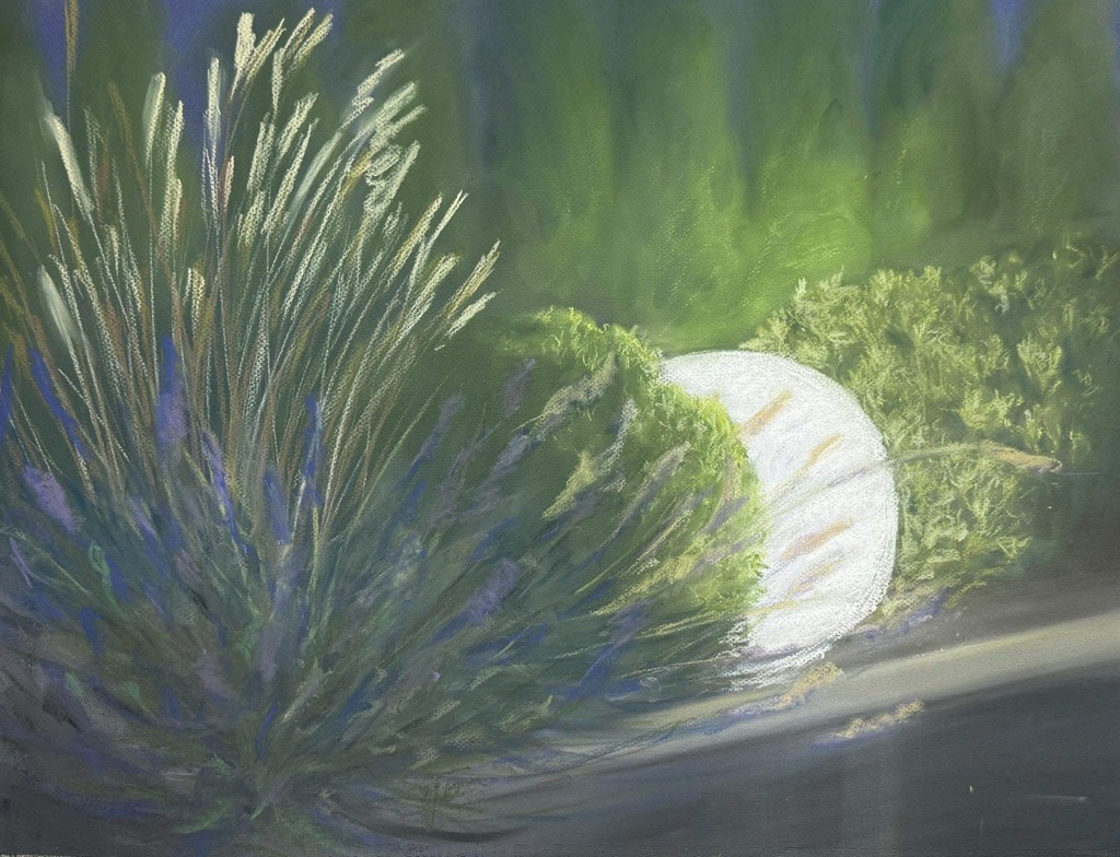 Kuiv- ja õlipastellmaal pastellipaberil. Maal on A2 mõõdus ja valmis 2025. aastal. Klaasitud 70% UV-kaitsega peegeldust vähendava kirka klaasiga, raamitud musta metallraamiga, sinine paspartuu valge lõikeäärega.